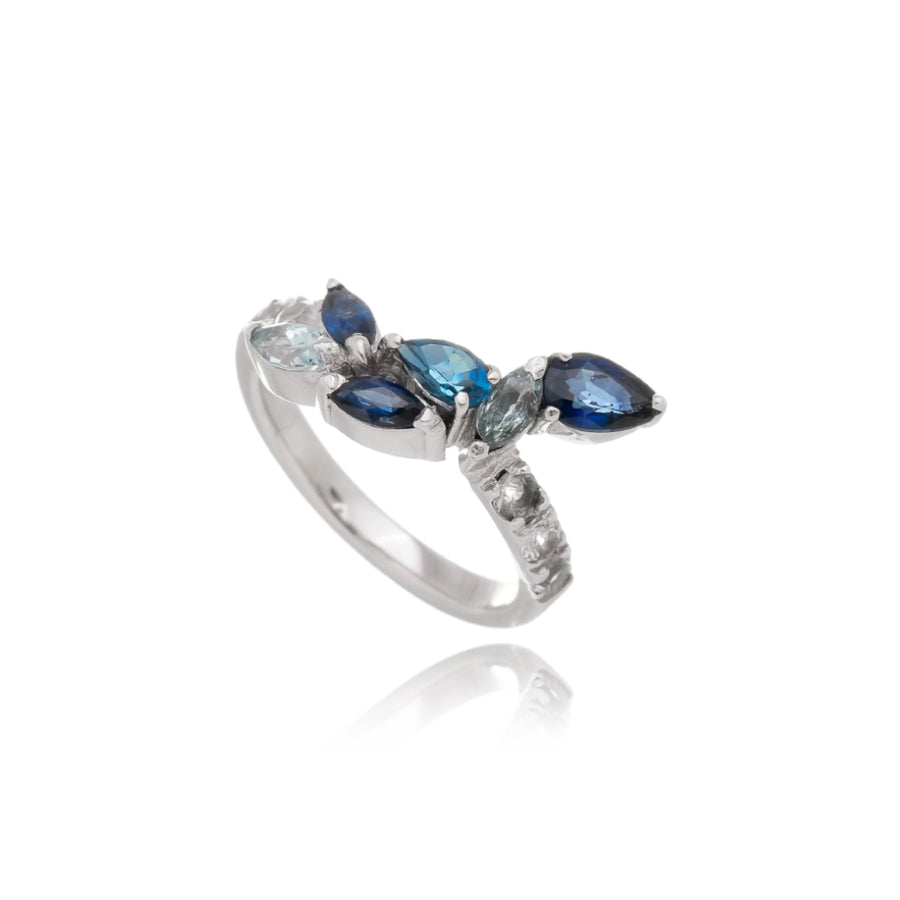 Anel ouro 18k, safira branca, safira azul, topázio sky e topázio london.